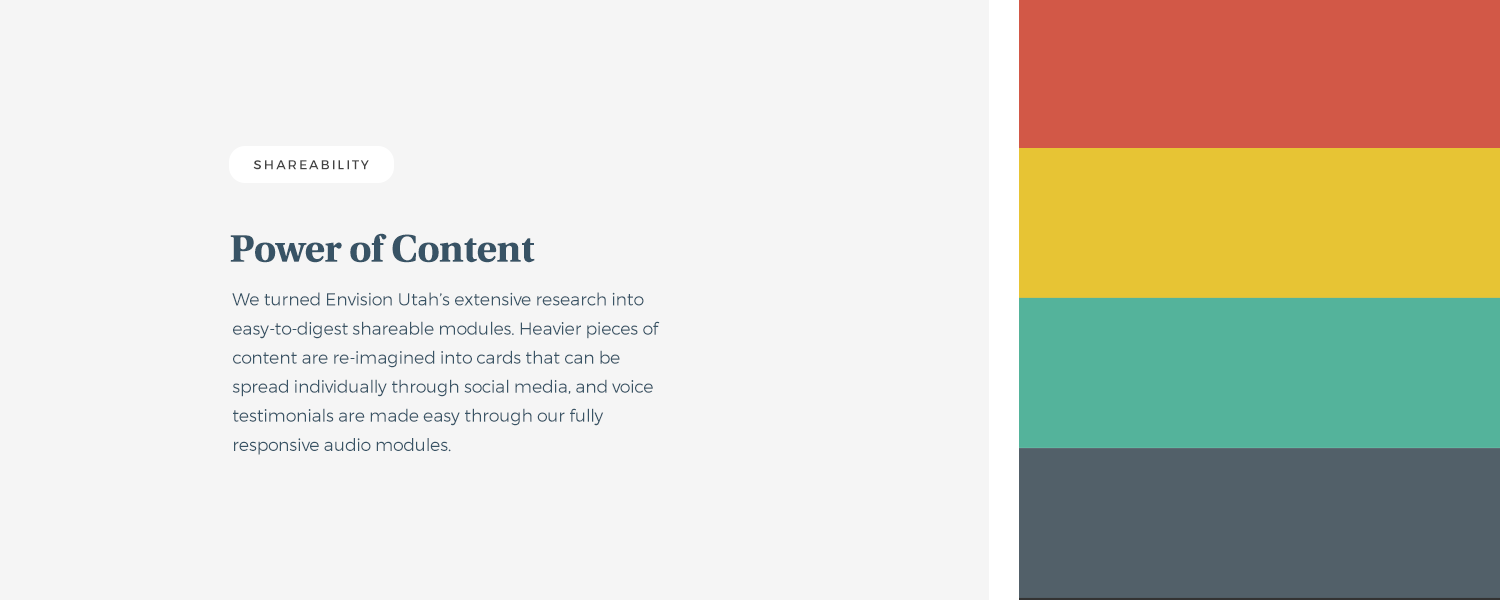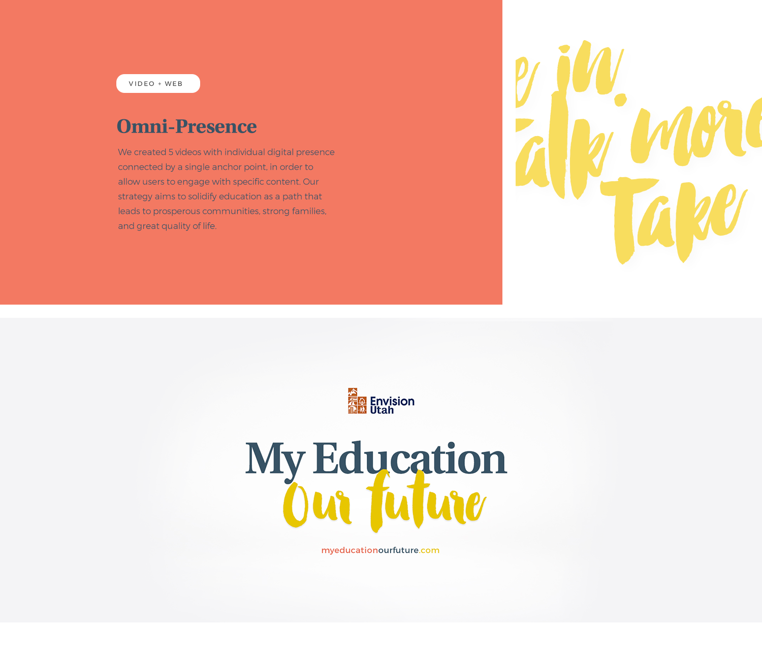 “My Education, Our Future” is a campaign run by Envision Utah that aims raise awareness to education-related issues. Our challenge was to create a consistent omni-present platform capable of delivering heavy information while remaining appealing.
